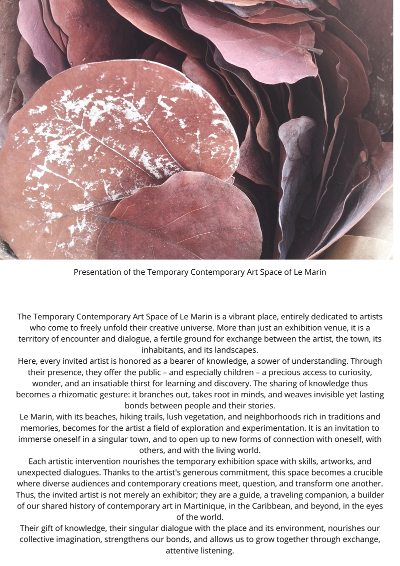 L’espace d’Art Contemporain Temporaire du Marin est un lieu de passage et de partage dédié aux artistes qui, dans toute la liberté de leur démarche, viennent présenter leurs travaux et offrir au public bien plus qu’une simple exposition : une rencontre vivante