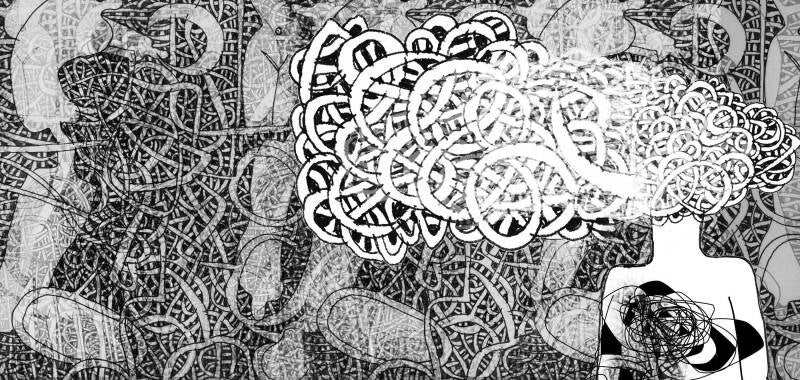 À droite, un entrelacs serré de lignes noires compose une trame dense, labyrinthique. Ce tissu graphique, presque calligraphique, rappelle les structures du rhizome : système souterrain d’interconnexions, il devient ici territoire vivant, palimpseste de la pensée caribéenne. Le corps humain, à demi absorbé dans cette matière complexe, semble émerger de cette mémoire souterraine comme une figure-archive, forgée par les histoires multiples, les transmissions ancestrales et les résistances silencieuses.