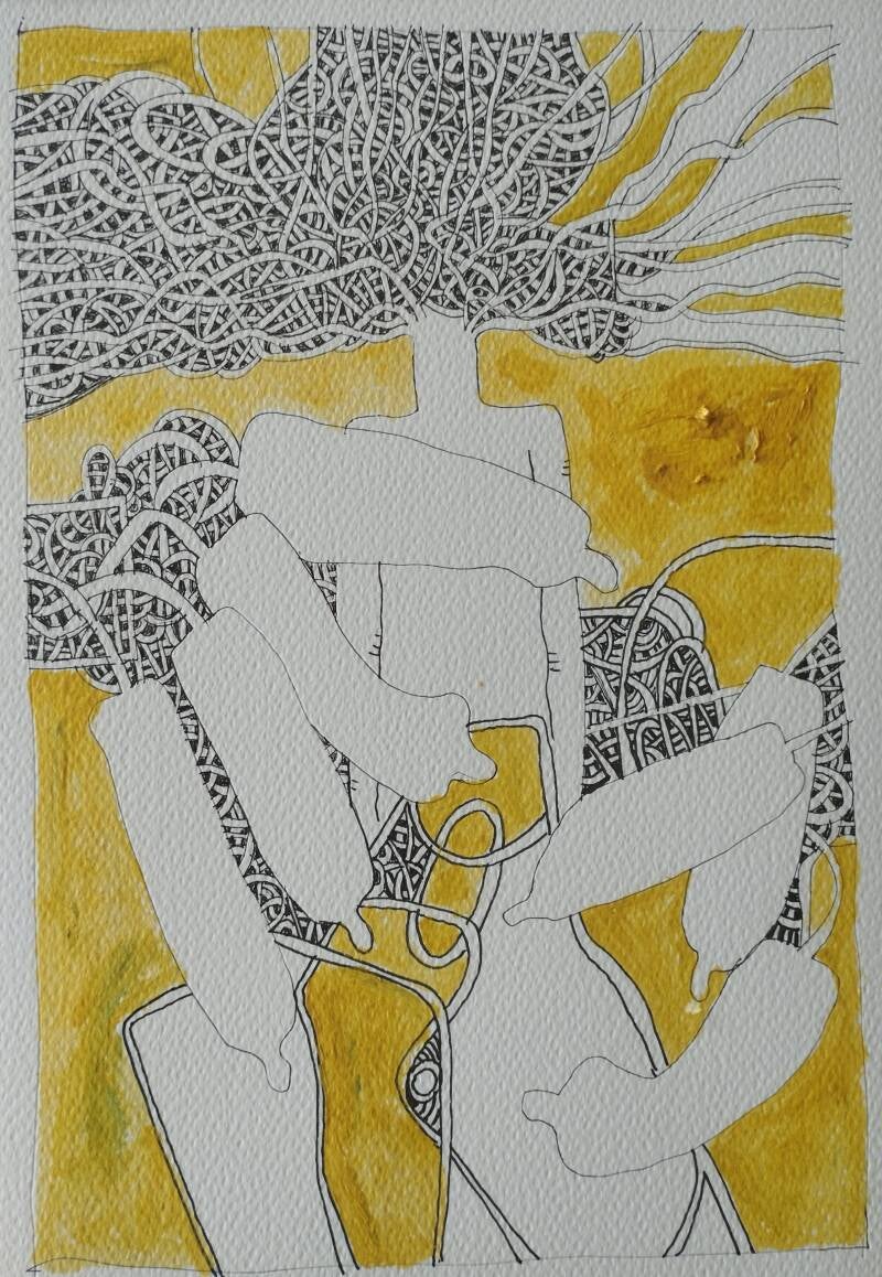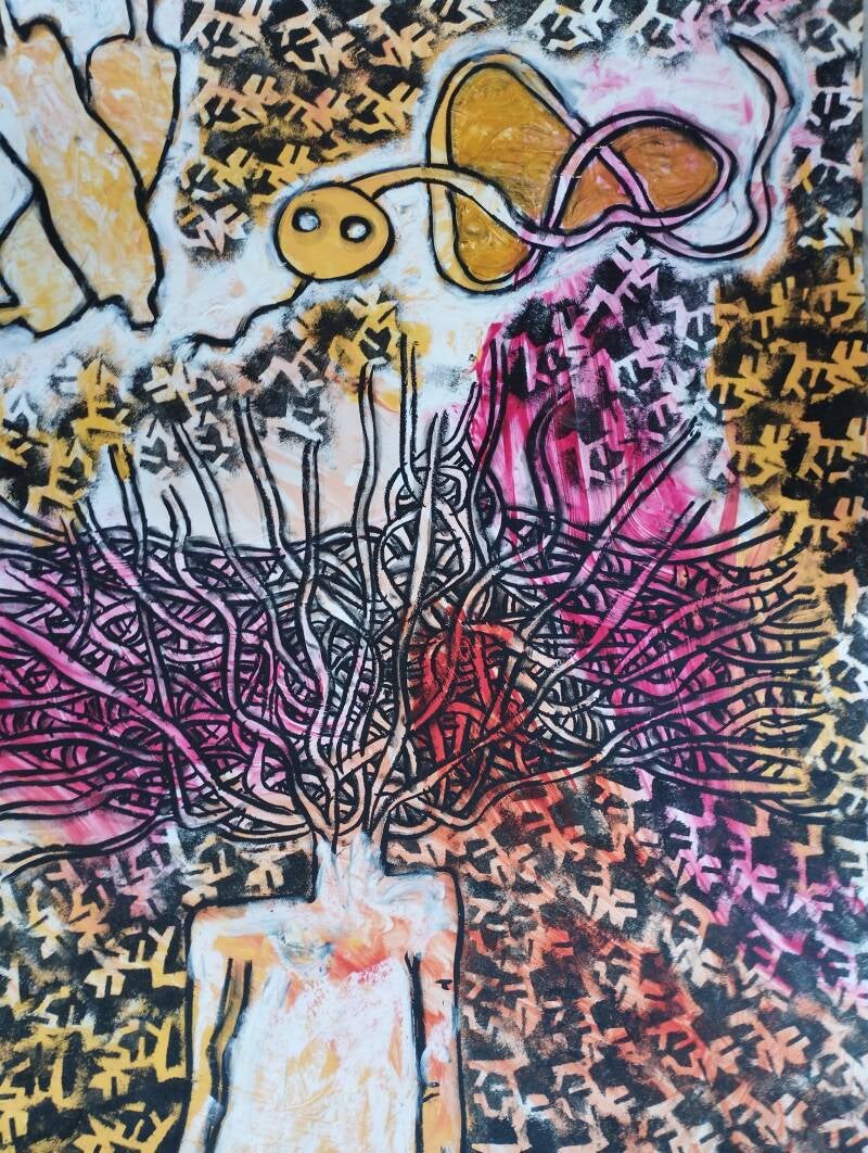 À gauche, en contrepoint, des rameaux jaillissent du torse, porteurs de feuilles stylisées. Cette partie aérée contraste avec la densité du réseau rhizomique : elle évoque l’expansion, la floraison, l’acte de transmettre. L’homme devient médium, relais entre le souterrain et le visible, entre le chaos fertile de la mémoire et la germination des savoirs vivants. Il est « homme du savoir » non par accumulation, mais par traversée : traversée des temps, des gestes, des matières.