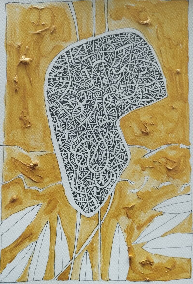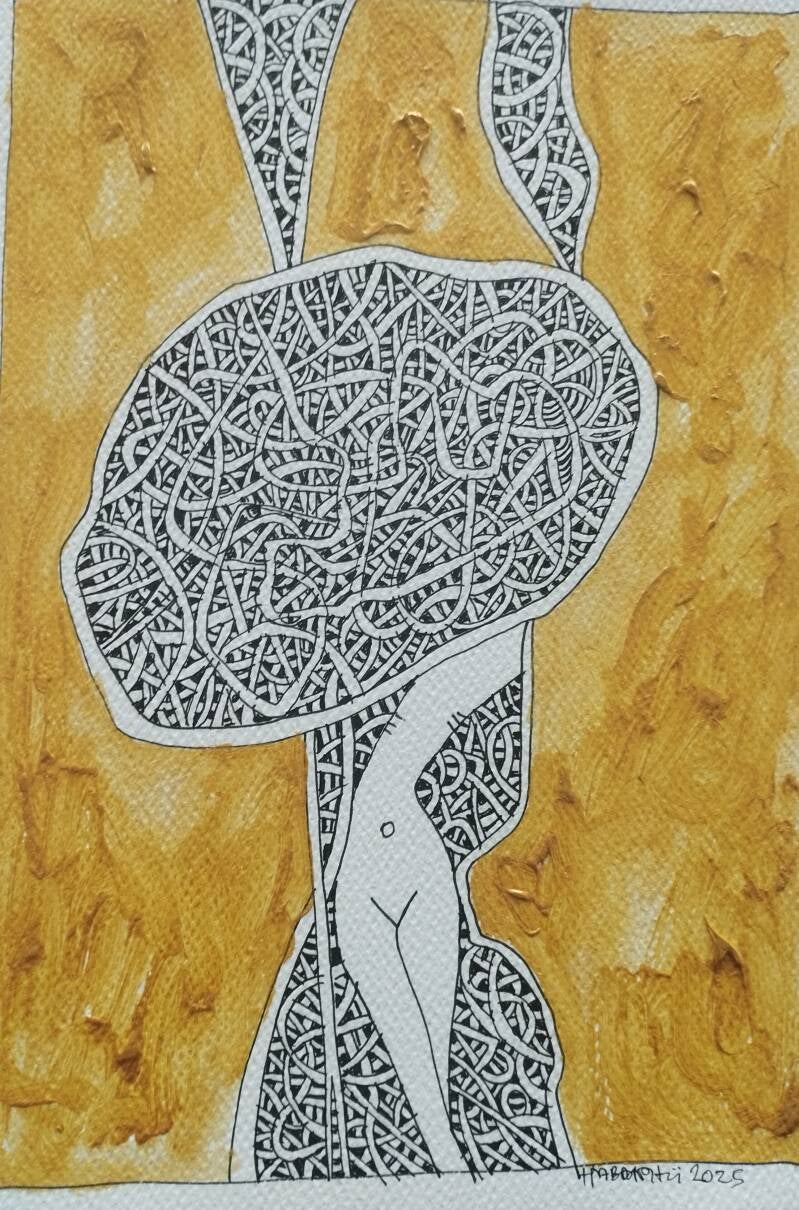 Dans cette œuvre au trait ciselé, sobrement intitulée L’Homme du savoir et l’espace rhizome, Habdaphai poursuit sa quête plastique et spirituelle, en traçant une figure hybride à la fois enracinée et en expansion. Réalisée au feutre noir sur papier kraft – matière brute, terrestre, évoquant les archives de la mémoire et les supports de fortune –, cette composition associe l’abstraction ornementale au geste symbolique.